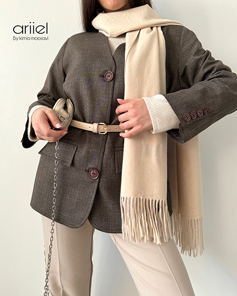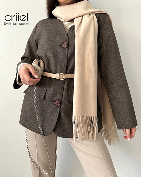 کت دانژه آریل دارای جنس فاستونی  می باشد و آسترکشی کامل شده است.مناسب فصل پاییز و زمستان است و فری سایز میباشد.