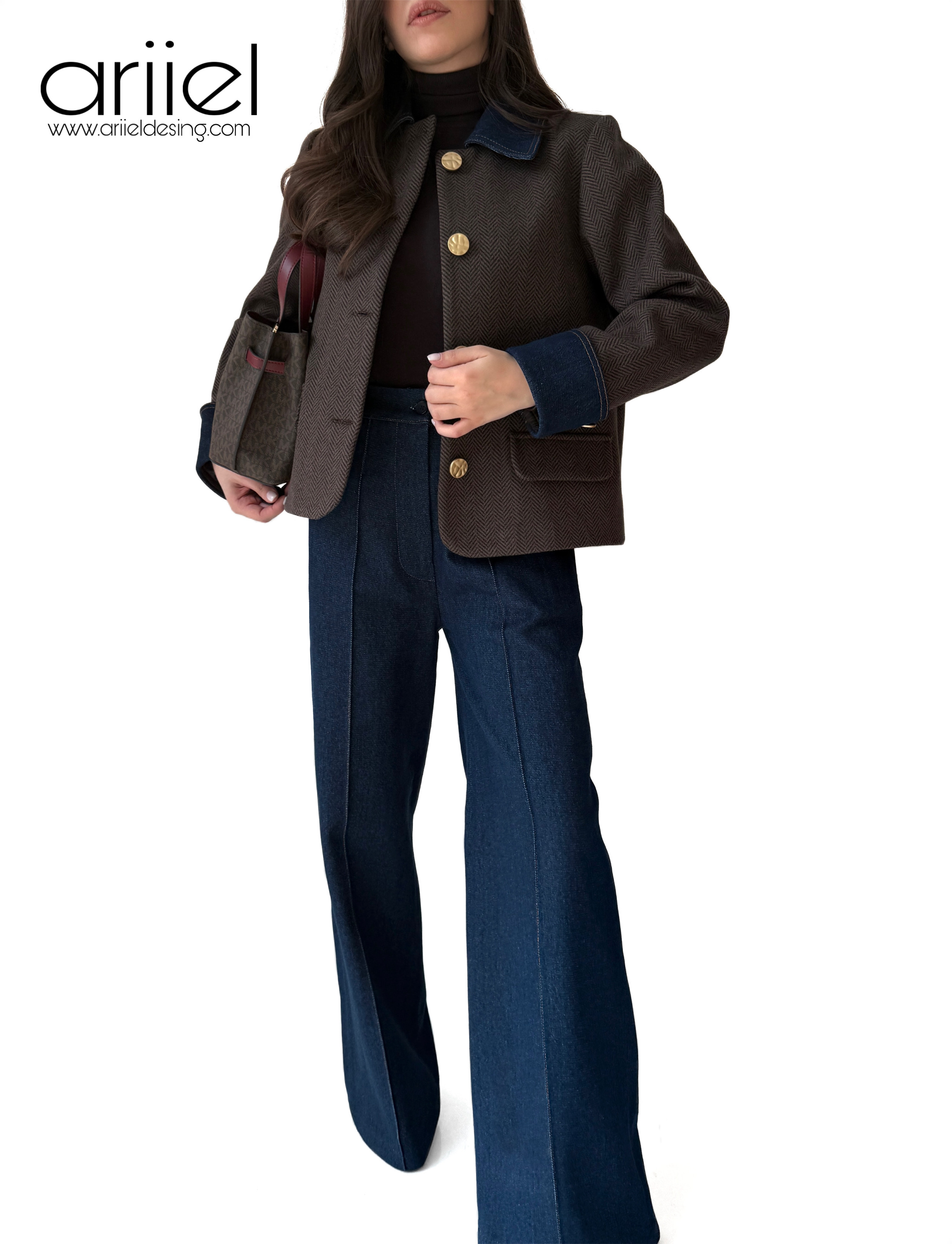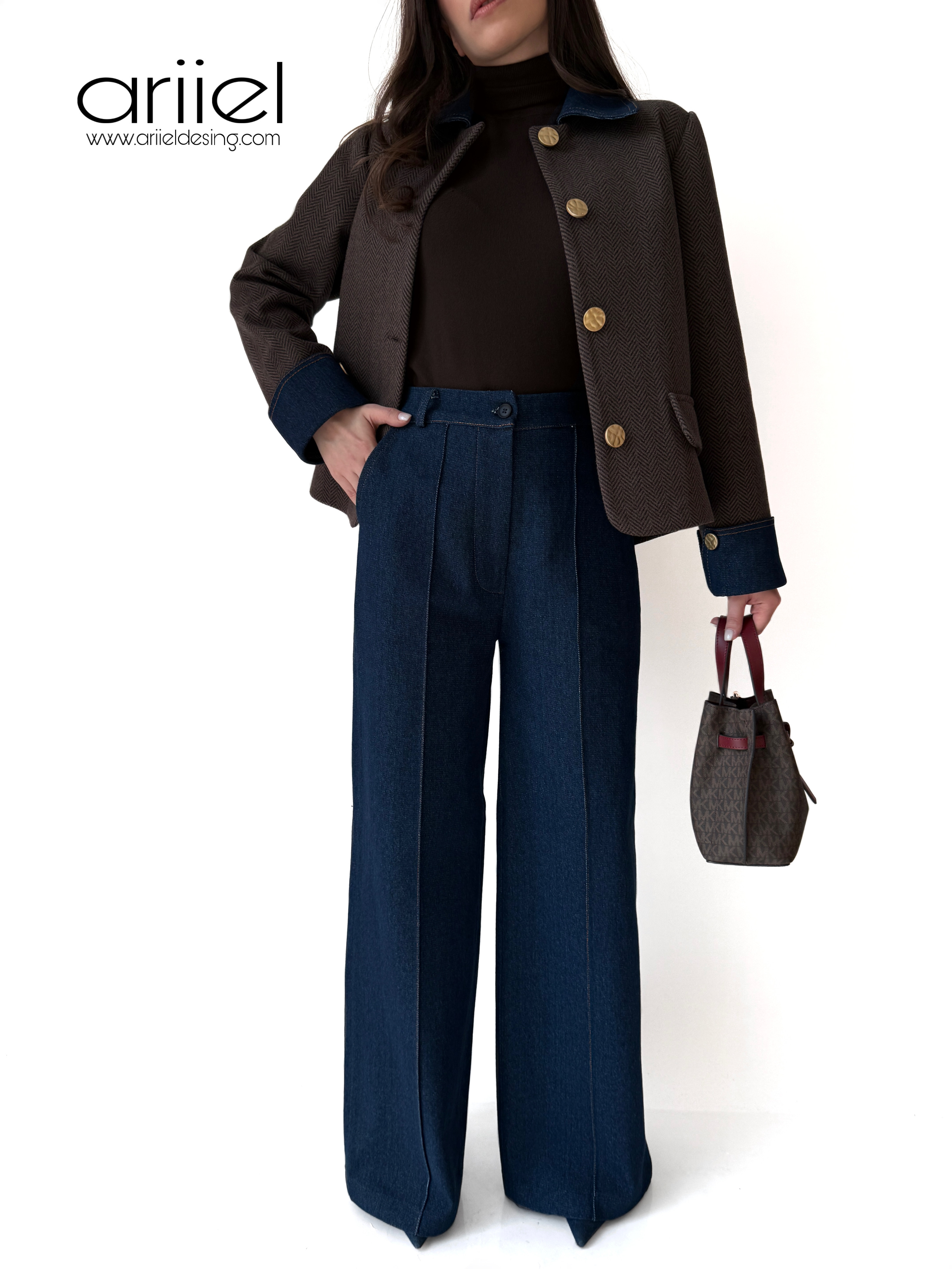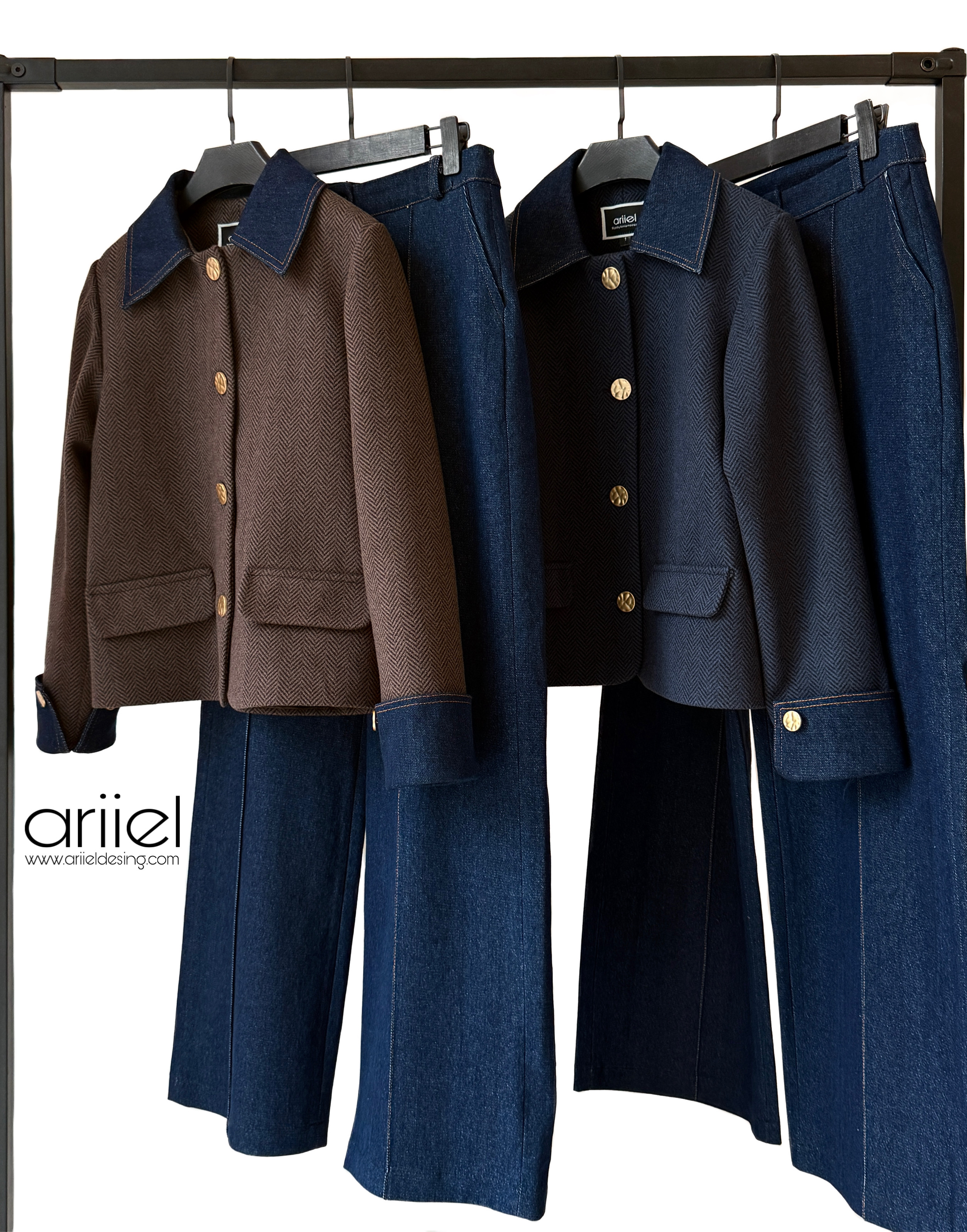 کت و شلوار Bella آریل دارای جنس جین شسته شده ترک گرم بالا و فوتر جناغی می باشد .مناسب فصل زمستان است.